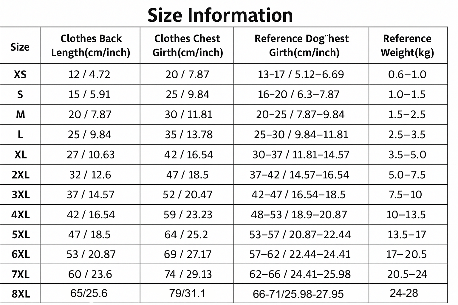 Measure your pet’s chest (bust) and back length, then choose a size 2–3 cm larger for a comfy fit.